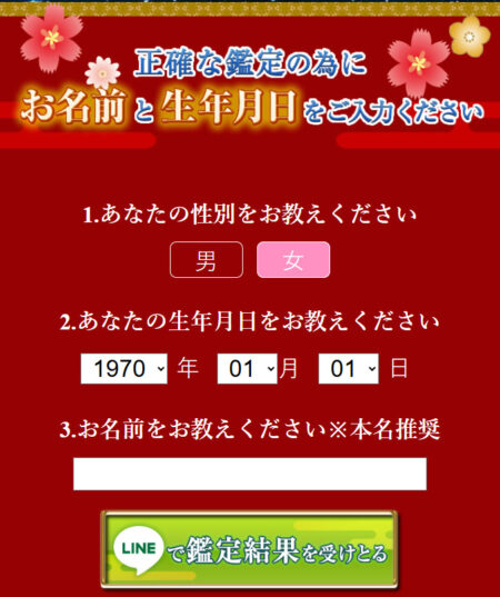 ③基本情報「性別、生年月日、名前」を入力後、「LINEで鑑定結果を受け取る」